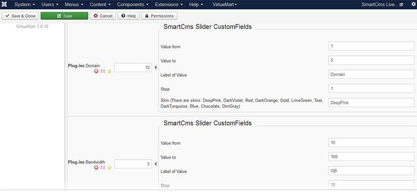 افزونه SmartCMS Product Builder for Virtuemart یک پلاگین جذاب و حرفه ای به منظور ساخت فیلدهای اضافی در ویرچومارت می باشد.توسط این پلاگین می توانید برای محصولات خود فیلدهایی به شکل اسکرول قرار دهید تا کاربر با جابجایی آنها بتواند محصول اختصاصی خود را تهیه کند .برای مثال برای خرید متراژ خاص از پارچه می تواند با جابجایی اسکرول متراژ مد نظر خود را سفارش دهد. همزمان با جابجایی اسکرول قیمت نهایی نیز محاسبه می شود .این پلاگین جذاب برای محصولاتی نظیر پارچه، کاغذ ، لباس و.. مناسب است.