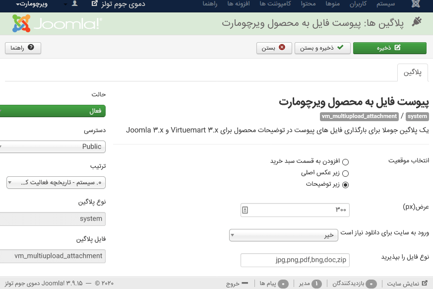 اگر شما هم جزو افرادی هستید که افزونه ویرچومارت را به عنوان فروشگاه ساز سایت خود انتخاب کرده اید ، و به دنیال راهی برای پیوست فایل های مختلف در صفحه جزئیات محصول می باشید ، این پلاگین بهترین راهکار برای این هدف شما می باشد.مثلا شما محصولی دارید مثل تلویزیون و قصد دارید فایل کاتالوگ آن که یک فایل PDF است به آن اضافه کنید . در حالت عادی چاره ای جز لینک دادن عادی در توضیحات ندارید. اما این پلاگین می توانید به راحتی فایل ها را در توضیحات محصول آپلود کنید و کاربر به راحتی فایل ها را دانلود کند. فقط باید پلاگین را به طور معمول نصب کنید ، آن را فعال کنید سپس می توانید فایل ها را به محصولات Virtuemart خود ضمیمه کنید ، نیازی به انجام کار دیگری نیست.